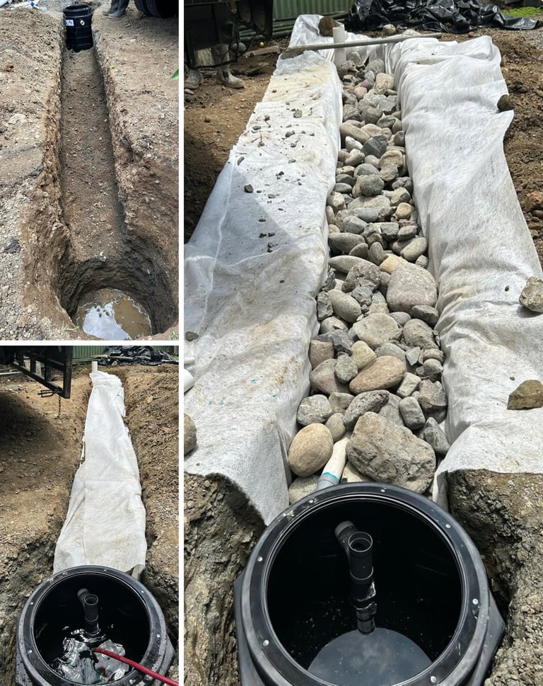 Construcción de drenaje francés para aguas jabonosas. Instalación de trampa de grasa. Conexión completa de tuberías sanitarias.